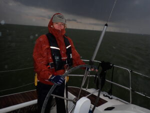 Während am Mittwochabend der frische Leberkäse im Backofen duftet, wird auf beiden Booten eine ausgiebige Sicherheitseinweisung durchgeführt. So kann es Donnerstag früh direkt zur Schleuse und dann auf das Ijsselmeer hinaus gehen. Unser Ziel, das Wattenmeer mit seiner wunderschönen Insel Vlieland. Länge läuft und so bringen uns die beiden Bavarias schon recht zügig voran. Doch ein aufkommendes Gewitter fordert unsere Aufmerksamkeit. Wir müssen für einige Zeit unseren westlichen Kreuzkurs aus der Lemmerbucht hinaus aufgeben und die Gewitterzelle umsegeln, was auch ein schnelles Einreffen der Segel mit sich bringt. Mitunter auch ein Manövertraining. Abgesehen von sehr dicken Regentropfen bleiben wir verschont und nehmen nach ein paar Seemeilen „Umweg“ wieder Kurs auf. Im Verlauf können wir auch wieder Stück für Stück ausreffen. Die Distanz von Lemmer bis zu den Wattenmeerinseln lässt sich zwar bei perfekten Bedingungen am Stück durchsegeln, wir aber möchten zum Einen der Geselligkeit eine Chance lassen, aber auch etwas von Land und Leuten sehen und laufen zum Abend somit Stavoren Buitenhavn an.